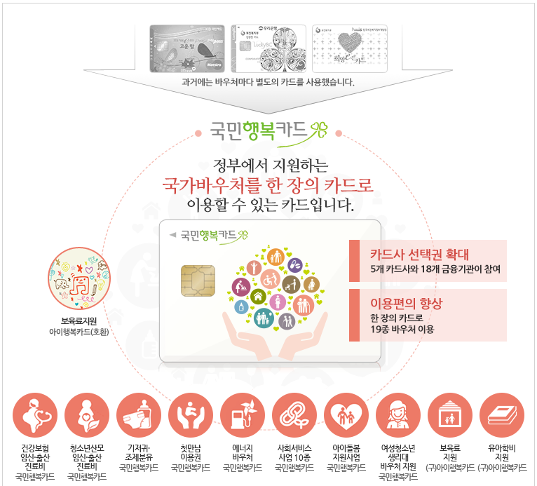 국민행복카드는 누구나 한 장의 카드로 다양한 국가 바우처를 이용할 수 있도록 만들어진 카드로 신용카드 또는 체크카드로 신청하여 발급받을 수 있으며 카드로 포인트를 지급받아 일반 신용카드처럼 사용할 수도 있습니다. 국민행복카드 발급 잔액조회 방법에 대해 알아보겠습니다.
