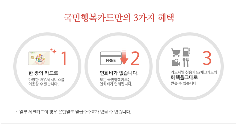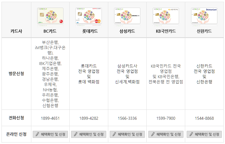 국민행복카드 발급은 은행별 직접 방문하여 신청할 수 있으며 온라인을 통해 간편하게 발급할 수도 있습니다. 5개의 카드사(BC, 롯데, 삼성, 국민, 신한)를 통해 각 은행과 연계하여 신청하며 바로 발급받을 수 있도록 안내해 드릴 테니 온라인으로 간편하게 신청하여 발급받으시기 바랍니다.