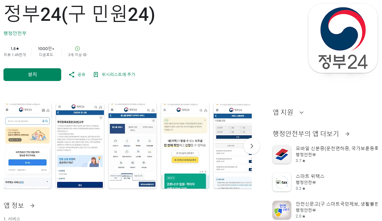 모바일 신분증을 발급받기 위해서는 신분증을 발급받을 수 있도록 앱을 설치해야 합니다. 대부분의 사람들이 가장 많이 이용하는 정부 24 앱을 통해 발급받을 수 있습니다. 정부 24 정부 24 앱 외에도 여러 방법이 있지만 정부 24 앱은 신분증 외에도 전입신고, 각종 서류, 금융 등 일상생활에서 반드시 필요한 정보들을 발급하거나 확인할 수 있기 때문에 되도록 정부 24 앱을 추천드립니다.
